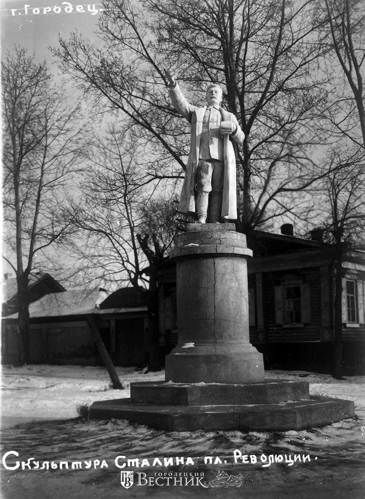 Другой снимок показывает противоположный край улицы. Там вместо бюста Александра II тогда стоял памятник И.В. Сталину (на фото справа), так как рядом располагалась Сталинская школа (музей «Дом графини Паниной»). Фотографии памятника до этого были известны, но он там виден только издалека. А здесь предстаёт прямо перед нами во всех деталях. Позднее, когда начнётся развенчание культа личности, памятник с постамента исчезнет, куда – неизвестно.