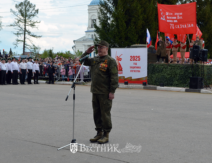Ровными шеренгами шагали по площади участники парада – знамённая группа радиотехнического батальона Кабачёво, войсковой части 18401, личный состав Городецкого пожарно-спасательного гарнизона МЧС России, полицейские, пограничники, десантники, ветераны боевых действий, студенты ГГК, юнармейцы. Трогательно и очень серьёзно, печатая шаг, прошёл отряд юных патрио-тов дошкольных учреждений, строй возглавил член Совета отцов Городецкого округа Павел Дмитриевич Рябинин.