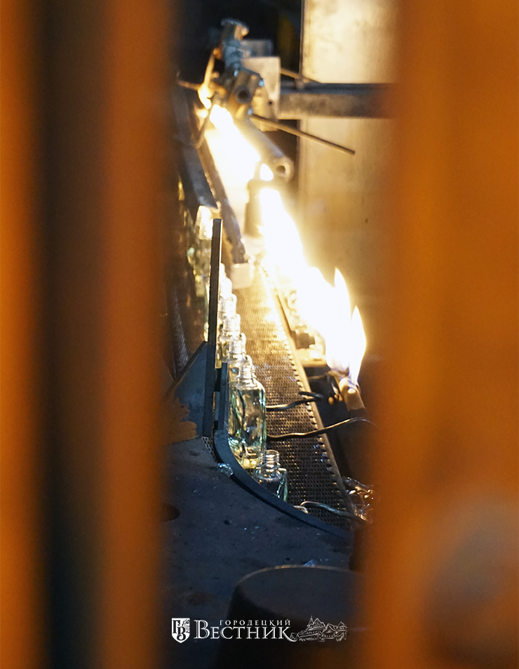 В цеху завода со стеклоформовочных машин на конвейер по одной спускаются ещё красноватые от жара бутылки. Они проходят через ряд горелок и уезжают на следующие технологические этапы. На выходе с производства всю продукцию на просвет проверяют контролёры качества, кажется, меньше чем за секунду определяющие брак и отметающие его из потока. Отдельные ленты выносят осколки бракованных изделий в металлические ёмкости для переплавки.