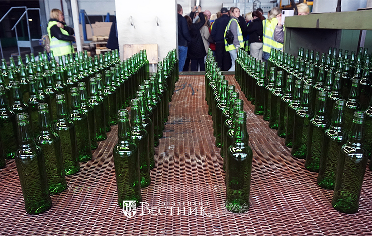 Далее два автобуса повезли нашу любопытную компанию на завод АО «Балахнинское стекло». Это единственное в России предприятие, где под одной крышей ведётся и производство стеклотары, и её декорирование (окраска, трафаретная печать, слив-этикетка и др.). Фирма специализируется на производстве сложной бутылки малыми партиями. Большая часть продукции идёт на экспорт. В последние годы заказчики из Европы отказались от сотрудничества. Теперь работа ведётся с клиентами из Азербайджана, Казахстана, Узбекистана, Беларуси, Киргизии и др.