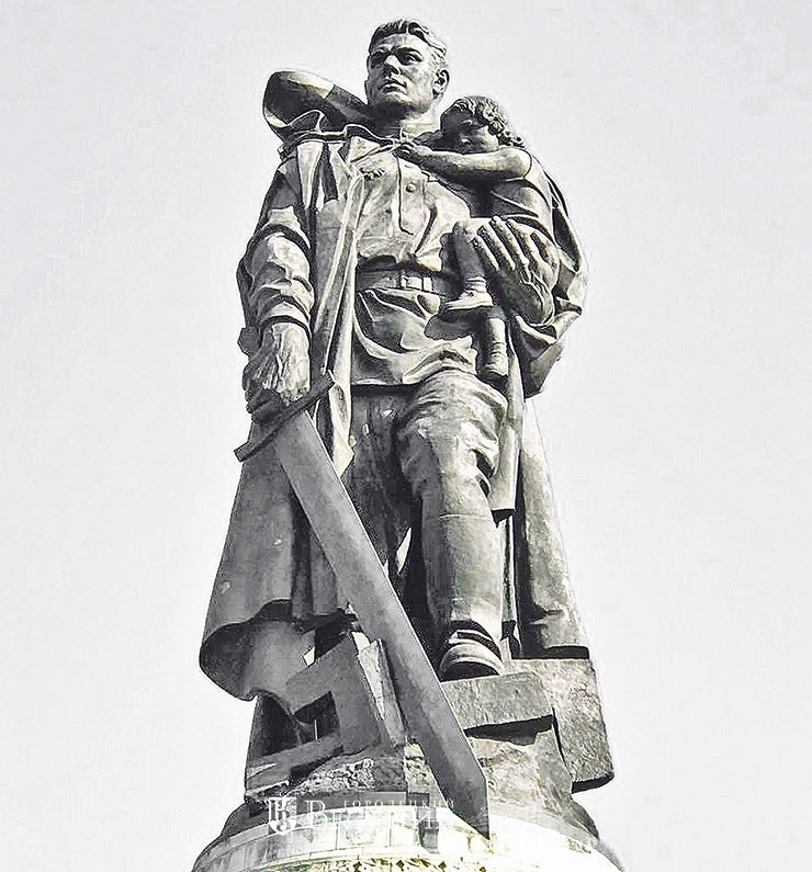 В Трептов-парке в Берлине стоит один из самых знаменитых монументов. Идея создания мемориала возникла сразу после войны, в 1946 году. Из 33 проектов победил проект архитектора Я.Б. Белопольского и скульптора Е.В. Вучетича. Сам И.В. Сталин утвердил его, но предложил заменить автомат в руках солдата на меч, разрубающий фашистскую свастику.