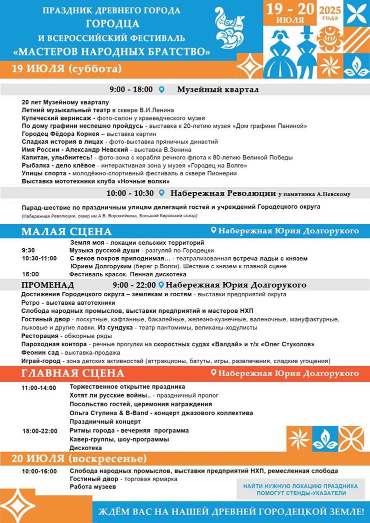 Гостей ждет расширенная программа: праздничное шествие делегаций предприятий и организаций Городецкого округа, традиционная театрализованная встреча ладьи с основателем города князем Юрием Долгоруким в сопровождении дружины, а также торжественная церемония вручения наград жителям муниципалитета.