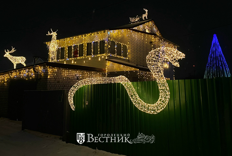 Им оказался молодой житель нашего города Дмитрий Кашигин, ему 28 лет, он занимается ремонтом и реставрацией автомобилей. Несомненно, Дмитрий – творческий и талантливый человек, поэтому он не ограничился просто украшением фасада светодиодными гирляндами (это можно увидеть на многих частных домах), а установил ещё и светящиеся фигурки, которые смастерил сам. Так на крыше дома появился олень, запряжённый в сани, олени стоят и на крыше гаража, в окно заглядывает Дед Мороз, на заборе сидит заяц, а недавно появилась змея – символ уходящего года. На участке стоит большая сверкающая ель, украшены гирляндами и другие деревья.