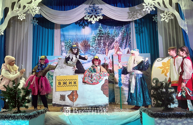Над постановкой работала творческая команда Дворца культуры. В представлении задействованы несколько главных героев, образы которых профессионально воплотили в жизнь творческие работники учреждения. Так, Снегурочку сыграла Д. Шарова, Деда Мороза – М. Телегин, Бабушку Метелицу – Е. Попрыго, двух Морозов – К. Муравьёв и В. Вшивцев, Снежанну Гололёдовну – А. Салимова, Медведей полярных – Анастасия и Софья Попрыго.