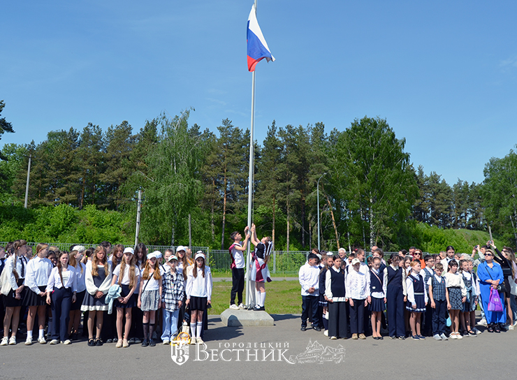 Под звуки Государственного гимна на флагштоке взвился флаг Российской Федерации. Почётное право поднять флаг получили ученики 11-го класса Алексей Митницкий, Елизавета Рожкова и Анна Котунова.