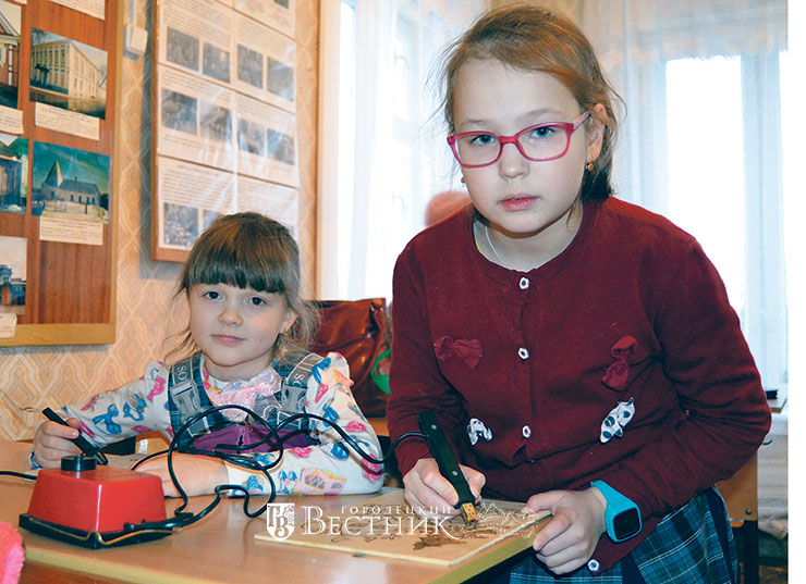 Второклассницы Вероника Шуракова и Ксюша Колотилова только начинают осваивать выжигание. Невольно любуюсь, какие красивые работы получаются: у одной – Кот Леопольд, у другой – ёлочка. А ведь это настоящее искусство. «Выжигатель сразу в руки мы не даём, нужна подготовка, – замечает руководитель кружка Ольга Александровна Дорофеева. – И в дальнейшем процесс выжигания только под нашим контролем!»