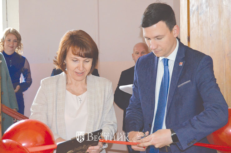 Глава МСУ Городецкого района А.Ю. Мудров и директор школы О.В. Гурьянова разрезают алую ленту, и начинается экскурсия по новым кабинетам.