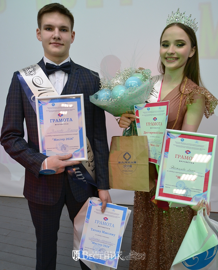 Среди юношей титул «Мистер спорт» завоевал Николай Васильков (он, кстати, был первым в спортивном испытании), «Мистер талант» – Максим Титов, «Мистер интеллект» – Вадим Шушунов, «Мистер креатив» – Даниил Букреев. А обладателями главных титулов «Мистер-2024» и «Мисс-2024» стали Максим Титов и Алина Дегтярёва (на снимке).