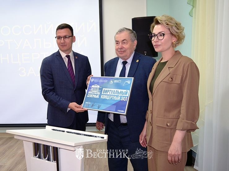 На открытии виртуального концертного зала, который располагается на первом этаже Дворца, Наталья Евгеньевна отметила важность происходящего события, пожелала дальнейших творческих успехов и пообещала, что в числе других замечательных локаций во Дворце обязательно должна быть и современная библиотека. А.Ю. Мудров, Н.Е. Суханова и председатель Земского собрания Городецкого округа Н.Ф. Поляков поставили свои подписи на вывеске, которая будет располагаться у входа в концертный зал.