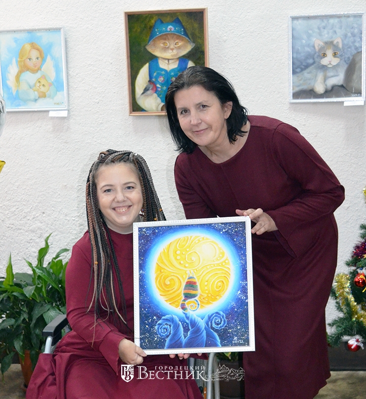 А сотруднику выставочного зала и руководителю приюта «Твой друг» Ирине Вячеславовне Березиной С.А. Чичерова подарила своего «Лунного кота» (на снимке) – с наилучшими пожеланиями!