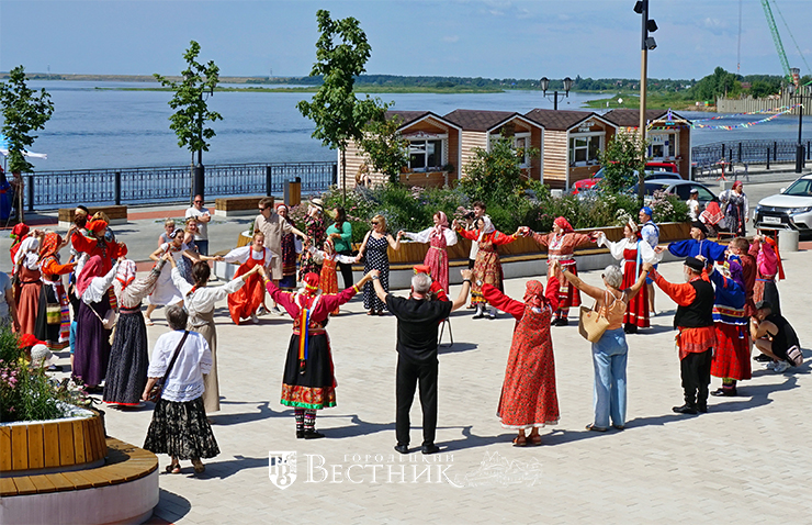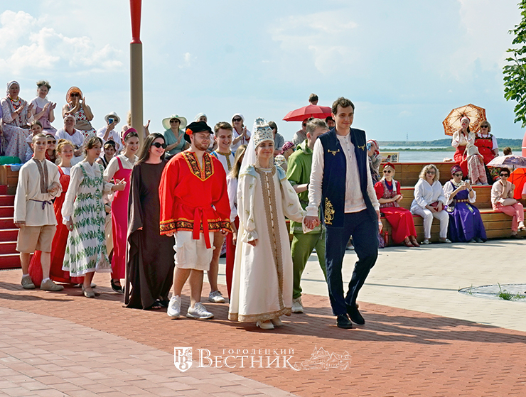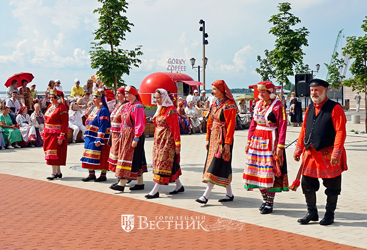 От площади Кольцова колодца праздничное цветастое шествие с песнями под гармошку прошло по историческим улицам Городца. На этот раз путь его лежал к новой благоустроенной площадке у «Города мастеров», где и развернулось гулянье.
