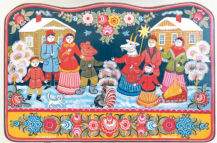Вот мужчины косят траву, а женщины зовут их отдохнуть, выпить молочка и закусить баранками. А вот пастух повёл из деревни коров (нечастых, кажется, героев росписи) на выпас. Это панно называется «Егорий Вешний» в честь святого покровителя пастушества. В другой сценке жители деревни рубят капусту в бочках, чтобы заквасить её. А дабы не скучать, им весёлую песню поёт гармонист. Бросается в глаза панно «Колядовщики», где изображены не просто гулянья, а колядки. Встретились вечером (тёмный фон уже смотрится интересно) две группы колядовщиков: одну ведёт ряженый медведь, другую – коза. И конечно, они несут с собой на палочке символ рождественской звезды. На другой работе селяне встречают сани с Дедом Морозом.
