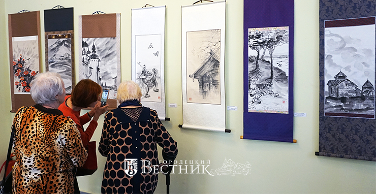 И.А. Левашёва с тремя ученицами прибыли в Городец на встречу с местной публикой. Людям было интересно посмотреть на искусство востока и пообщаться с русскими художницами монохромной живописи.