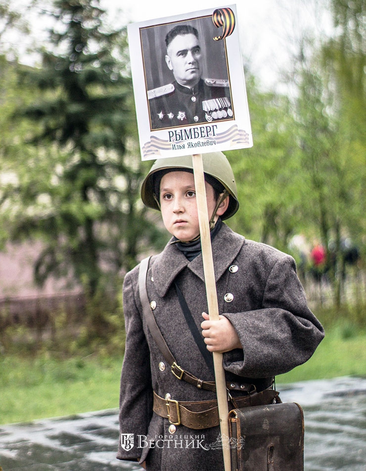 Особо обращал на себя внимание мальчик в военной шинели. Это ученик 3 класса школы № 18 Серёжа Щербаков. Он нёс фотографию своего прапрадедушки. Мама Сережи, Наталья Щербакова, рассказала, что шинель привёз из армии папа мальчика, каску подарили, а планшет достался от самого прапрадедушки – Ильи Яковлевича Рымберга, подполковника, который посвятил всю свою сознательную жизнь делу служения Родине. В годы войны Илья Яковлевич воевал под Сталинградом, прошёл Австрию, Венгрию, Чехословакию. Был награждён орденом Красного Знамени, двумя орденами Красной Звезды, орденом Отечественной войны II степени и многими медалями.
