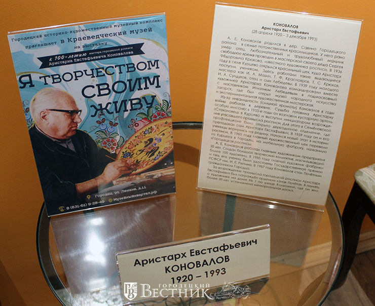 В уютном зале музея разместилась выставка работ Аристарха Евстафьевича. На ней представлены живописные работы мастера, выполненные в 1980-1990 годах, как из фондов Городецкого музейного комплекса, так и из коллекции семьи Коноваловых. Здесь также можно увидеть цветочные орнаменты на альбомных листах, по которым приёмами городецкой росписи овладевали в 1957 году учащиеся Семёновской профтехшколы. Интересны будут и жбанниковские свистульки, которые сделала П.И. Тимофеева, а расписал А.Е. Коновалов. Здесь же можно увидеть и личные вещи художника – палитру, кисти, его любимые шляпы и знаменитую жёлтую трость, которой некоторые даже побаивались.