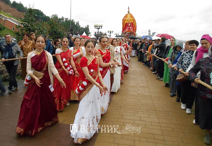 И конечно же, кульминацией праздника стало шествие колесницы, которую за два огромных каната тянули вдоль Нижне-Волжской набережной все желающие. А таковых было немало – ведь прикосновение к канату считается благословением Божества и обретением в душе мира и любви. С колесницы участники фестиваля получали в дар от Божества фрукты: апельсины, яблоки, бананы. Шествие колесницы сопровождали танцовщицы – конечно же, не индианки, а самые настоящие нижегородки, в том числе и маленькие девочки, но в национальных костюмах, с причёсками и макияжем. Умело выполняя все необходимые движения, они выглядели очень красиво – казалось, что волшебный праздник перенёс всех в Индию, правда, почему-то, в сезон дождей.