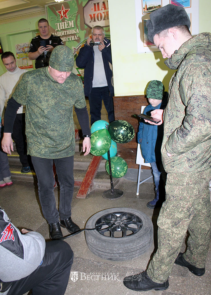 Папам предстояло немало испытаний: разборка-сборка автомата, стрельба по мишени, забивание гвоздя, ралли по заснеженной улице, накачивание шины. С особой заботой папы участвовали в конкурсном задании «Пристегни самое дорогое», правда, вместо ребёнка должны были пристёгивать куклу.