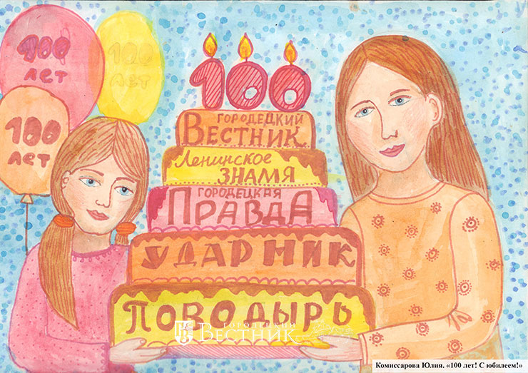 3 место – Юлия Комиссарова (9 лет), «100 лет! С юбилеем!» (Детская художественная школа г. Городца, преп. М.Ю. Плеханова);