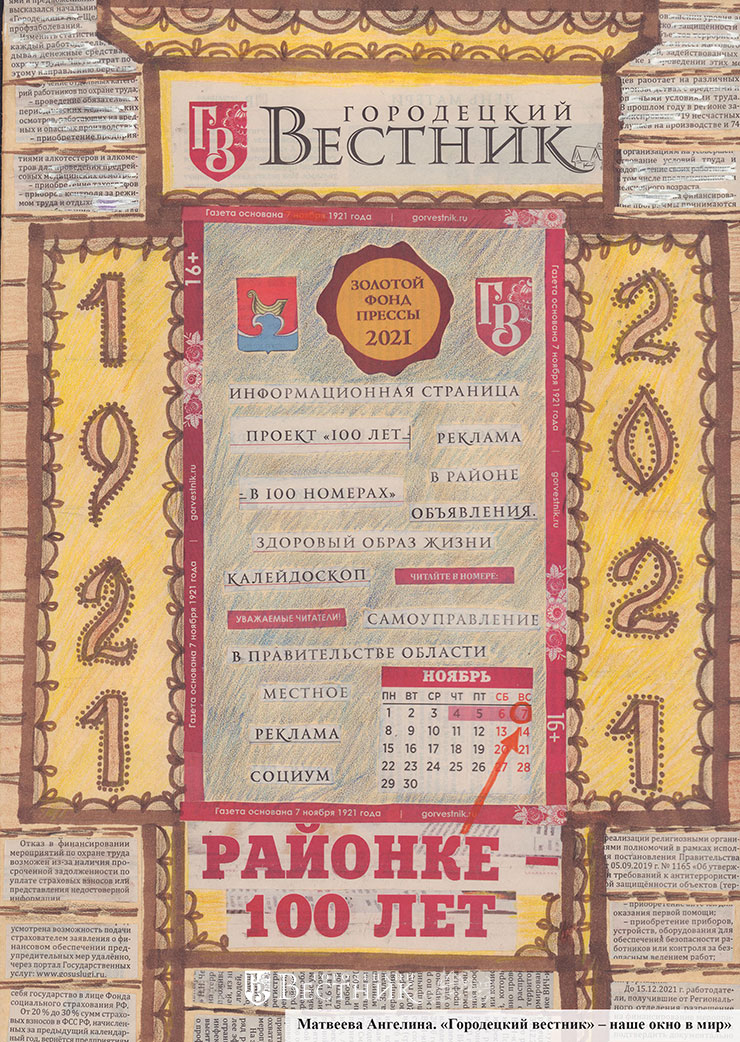 В дополнительной номинации «Спасибо за идею» отмечена работа Ксении Павловой (11 лет) «Логотип газеты «Городецкий вестник» (Детская художественная школа г. Городца, преп. В.Л. Толстова).