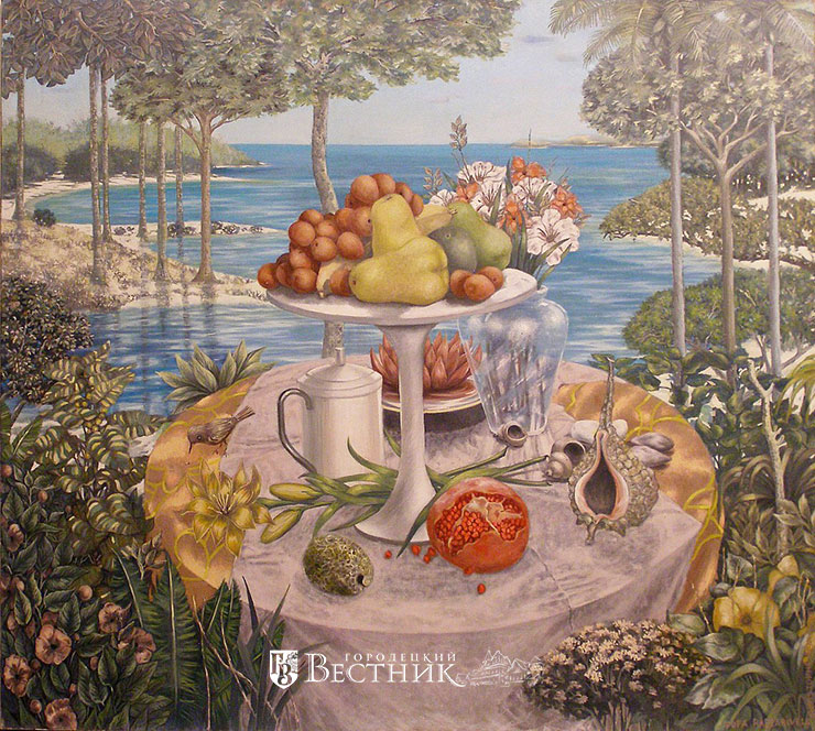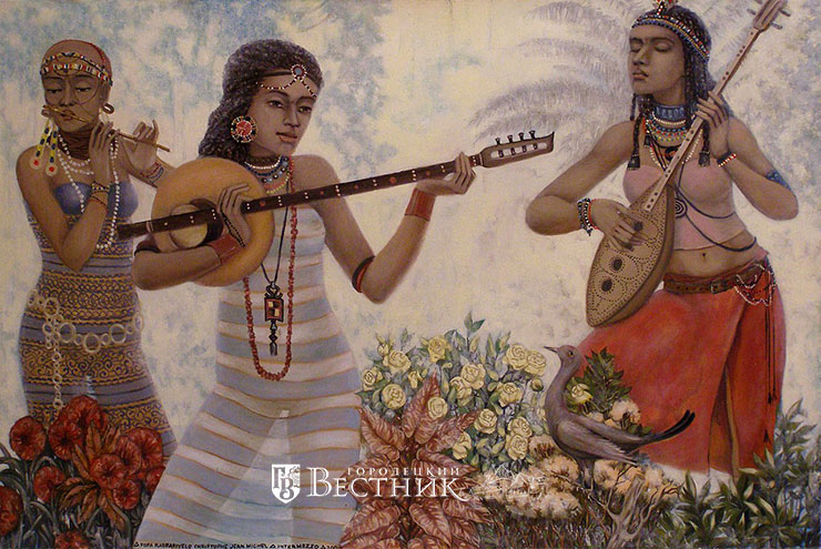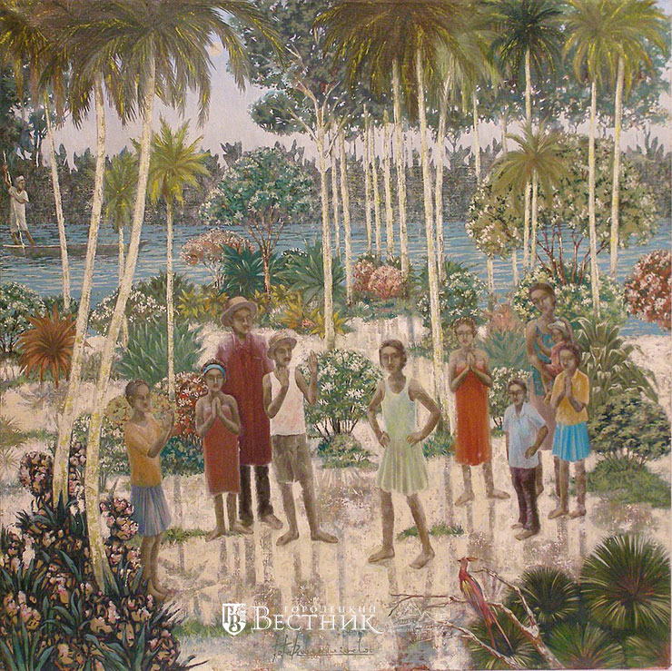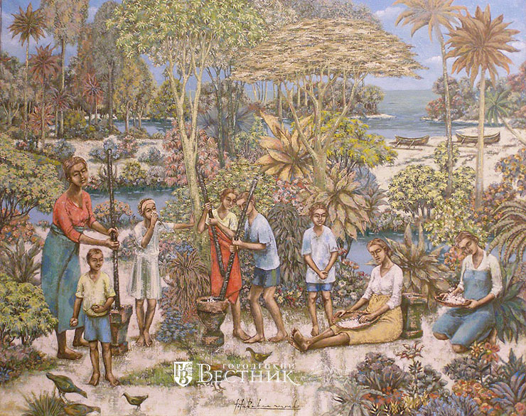 Вообще я выступаю за глобализацию, считаю, что все люди братья, все должны жить в мире и счастье. И на моих картинах можно видеть, что у мулатов лица могут быть европеоидные, украшения какие-нибудь из разных стран, разные детали смешанные, заимствованные. Для меня это важная тема.