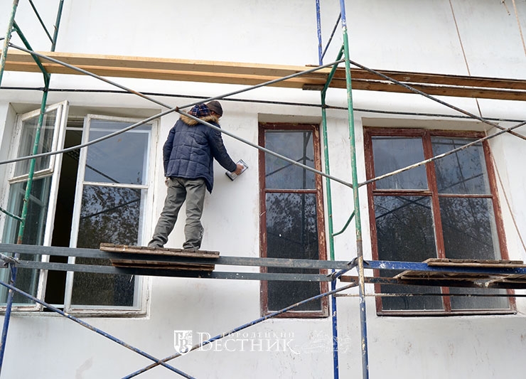 Здание городской поликлиники – в строительных лесах. К началу октября почти все стены уже окрашены в нежный бежевый цвет. На первом этаже стоит густая пыль от строительных материалов.