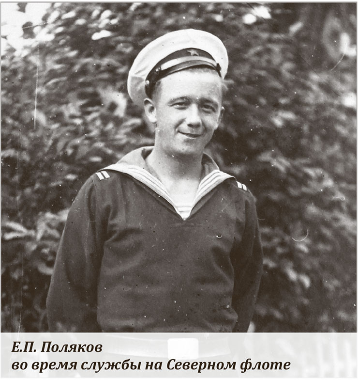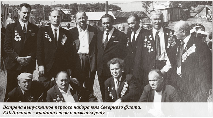 А в заметке Б. Ломова «Дружба, скреплённая кровью», посвящённой встрече троих боевых друзей Е.П. Полякова, А.Н. Блинова и А.Ю. Юсипова (газета «Мотор» от 6 мая 1972 года), читаем: «Женя Поляков, а теперь уже Евгений Петрович – слесарь-электрокарщик литейного корпуса № 1, работает на нашем заводе с 1960 года. Его отец погиб в борьбе с немецкими захватчиками в 1942 году, и пятнадцатилетний парнишка, решив мстить за его смерть, поступает в школу юнг, а после её окончания в составе Краснознамённого Балтийского флота громит фашистов на подступах к Ленинграду. Он воевал на канонерской лодке, затем на эскадренном тральщике, участвовал в снятии блокады Ленинграда, освобождении Прибалтики, высадке десанта под Нарвой. В Кронштадте окончил электромеханическую школу, из которой вышел в звании старшины 1 статьи – и снова бои. Свою службу на флоте Евгений Поляков закончил в 1950 году и с этих пор отдал себя мирному труду на благо Родины. Несколько правительственных наград – вот итог его боевой службы».