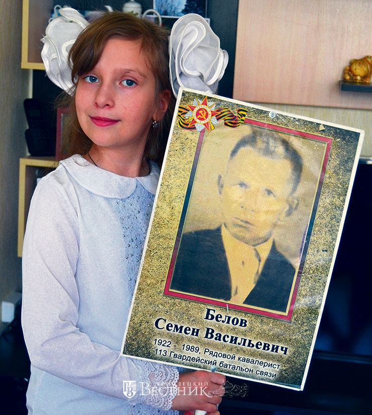 Мой прадедушка Семён Васильевич Белов как будто всегда со мной. Я делаю уроки, а он смотрит на меня с фотографии. Его совсем молодое лицо – на штандарте, который мы с мамой носим на Парад Победы. Этот портрет стоит справа от моего письменного стола.
