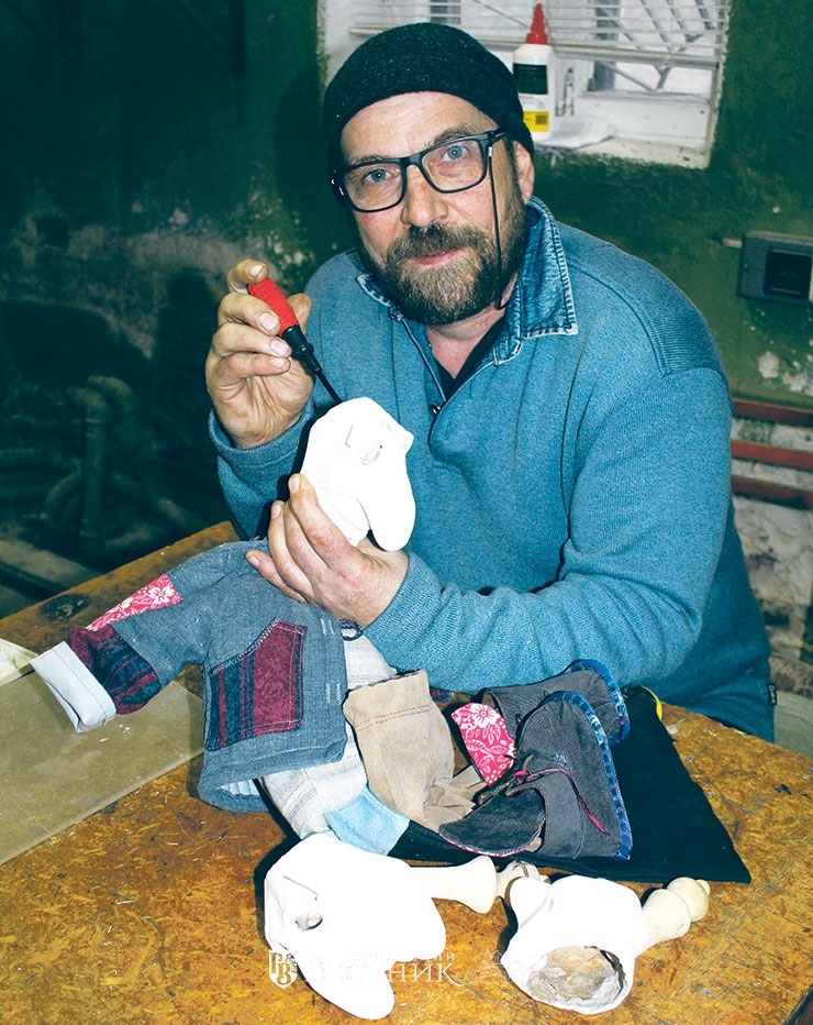 Мы встретились с ним в новой мастерской, расположенной на площадях бывшей медтехники, принадлежащих сейчас досуговому центру. Здесь вовсю идут репетиции, уже видны основы будущих декораций, создаются куклы, одёжки для которых шьёт костюмер ДЦ «Метеор», художник-модельер Татьяна Сорокина.