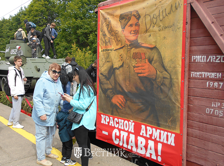 И вот громкий гудок паровоза оглашает окрестность и знаменует собой прибытие в наш город «Поезда Победы». Это уникальный проект Горьковской железной дороги, благодаря которому мы имеем возможность посмотреть, как выглядел эшелон, на котором отправлялись на Великую Отечественную войну отцы, деды, прадеды. Впереди состава – паровоз с красной звездой и дымящей трубой; вагон-теплушка, в котором перевозили солдат; санитарный вагон-госпиталь для перевозки и лечения раненых бойцов; платформа с военной боевой техникой, на которой стоят танк «Т-34-85», самоходно-артиллерийская установка САУ ИСУ-122, противотанковая пушка «ЗИС-2», пулемёт «Максим», легендарные «катюша» и «полуторка».