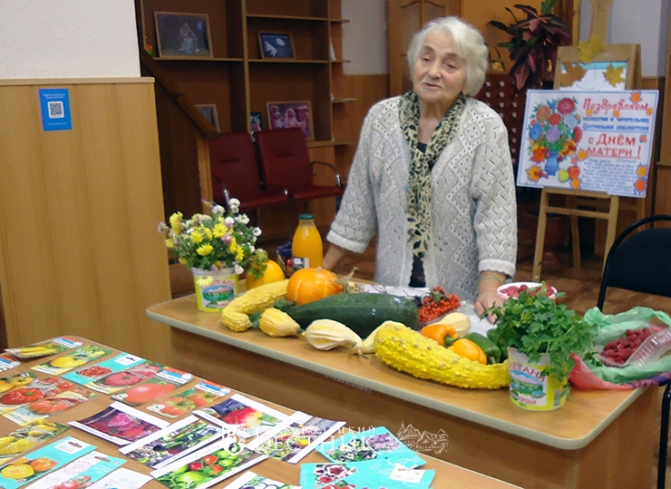 На правах хозяйки место за столом заняла Надежда Александровна Матвеичева, руководитель клуба. Перед нею разложены дары урожая – как обычно, он у Н.А. Матвеичевой обильный и оригинальный. Тут же – пакетики с названием семян, среди них в основном помидоры, а также тыквы и кабачки. По рядам пущено угощение – малина сорта «Васёна», замороженная, но всё такая же сладкая.