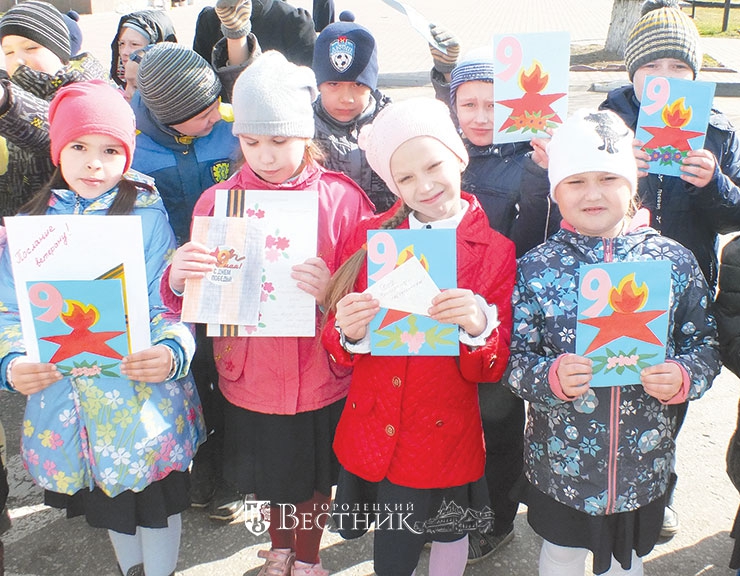 Перед стартом прошёл торжественный митинг. На этот раз он был проведён в новом формате – у «Книги памяти» и Вечного огня, в тёплой дружеской обстановке. В митинге приняли участие и первоклассники из школы № 2 (на снимке), они подготовили для марафонцев самодельные открытки – в подарок ветеранам.