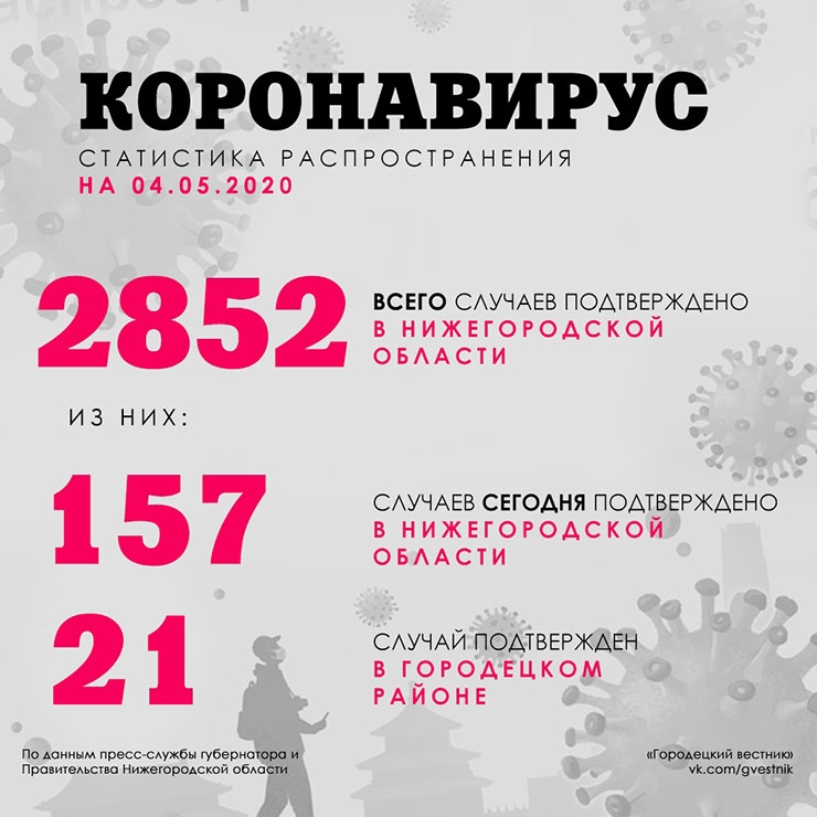 По состоянию на 4 мая 2020 года, в Нижегородской области подтверждено еще 157 случая заражения коронавирусной инфекцией. В регионе верифицированы пробы на коронавирус у 2 852 человек. 389 человек выздоровели и выписаны. Всего протестированы 90 277 человек.
