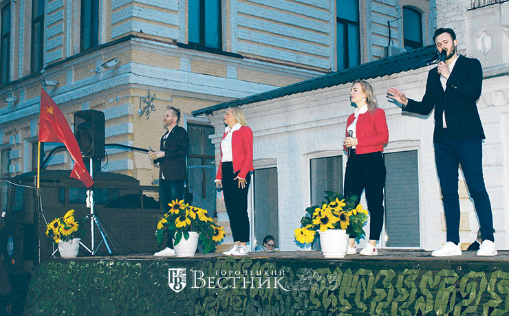 Но это не помешало городчанам праздновать 9 Мая, увидеть прекрасную постановку у здания администрации, услышать новую песню Дмитрия Глыбина, которую наш замечательный автор и исполнитель спел вместе с супругой Екатериной и дочкой Анечкой, стать свидетелями ещё одного творческого дебюта – песня «День Победы» впервые прозвучала в исполнении Анатолия Кафарова, Дмитрия Глыбина, Дмитрия Порунова, Дмитрия Попутникова и Юрия Волкова.