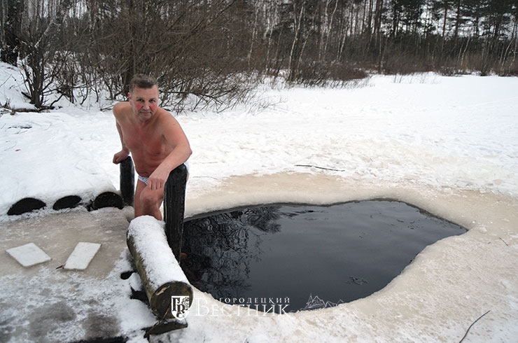 Заволжские «моржи» прибегают к проруби рано утром. Молодым надо успеть на работу. Люди постарше тоже любят утренние часы, чтобы получить на весь день заряд бодрости. Вот и накануне Крещения, 17 января, застаю у проруби несколько таких энтузиастов. Геннадий Александрович Кривошеев уже вышел из проруби и не торопясь обтирается полотенцем. От тела идёт пар, щёки горят розовым румянцем, на лице – довольная улыбка…