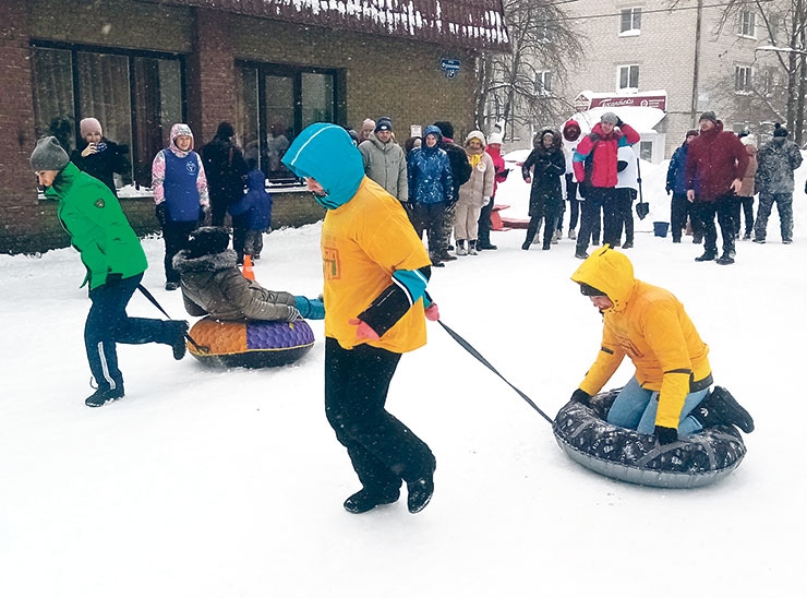 Организаторы приготовили для участников много трудных, но весёлых эстафет. Шуточный биатлон, когда каждый из четверых членов команды должен пробежать на лыжах между конусами до отметки, попасть мячиком в корзину, затем, объехав её, вернуться. Задача импровизированного кёрлинга состояла в том, чтобы с помощью специальных «щёток» двигать перевёрнутое ведро между конусами. Самым энергичным был этап катания на ватрушках: в одну сторону один везёт второго, в другую – второй первого. А вот внутри трека – полосы, исполняющей роль ходовой гусеницы – ходить пришлось всем составом команды.