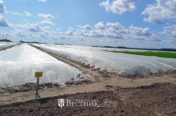 В первый год клубни в поле покрывают специальным материалом, который предохраняет картофель от вредителей и болезней, все обработки ведутся поверх ткани.