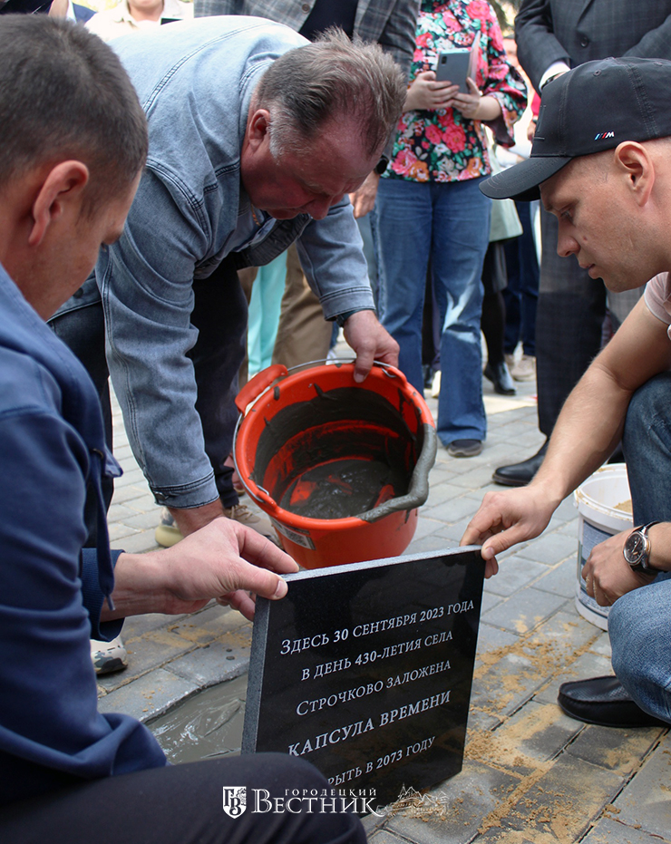И вот она – торжественная закладка «Капсулы времени». Надпись на гранитной плите гласит: «Здесь 30 сентября 2023 года в день 430-летия села Строчково заложена КАПСУЛА ВРЕМЕНИ. Вскрыть в 2073 году».