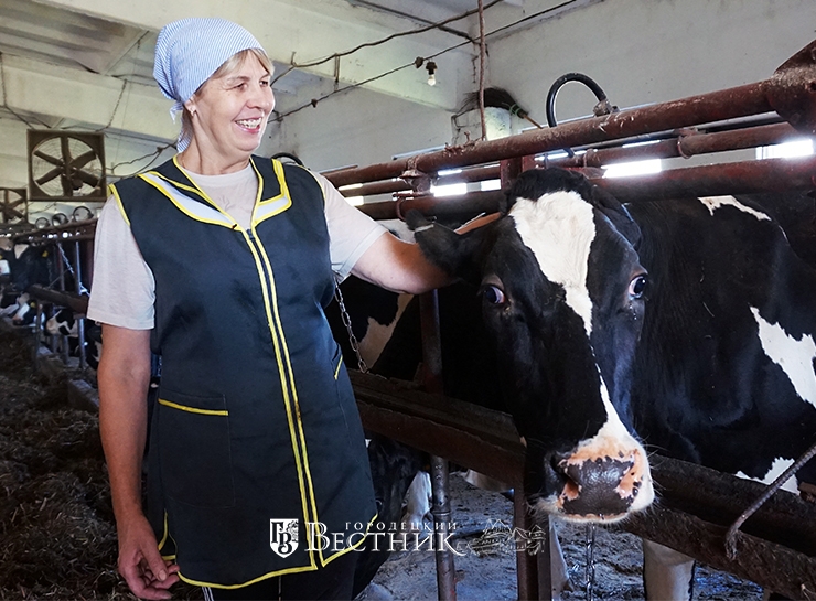 Со своей сменщицей на ферме колхоза им. Куйбышева она ухаживает за 65 коровами. И у каждой есть кличка. Работа начинается в пять утра. Животных нужно покормить, угостить посыпкой, картошечкой. Посмотреть на их состояние, настроение, погладить и приласкать. Доят коров несколько раз в день. Для этого оператор машинного доения собирает тележку со всем необходимым: несколько доильных аппаратов, которые подключаются к молокопроводу, полотенца и средства для санитарной подготовки вымени и обработки после дойки, и идёт в стойло.