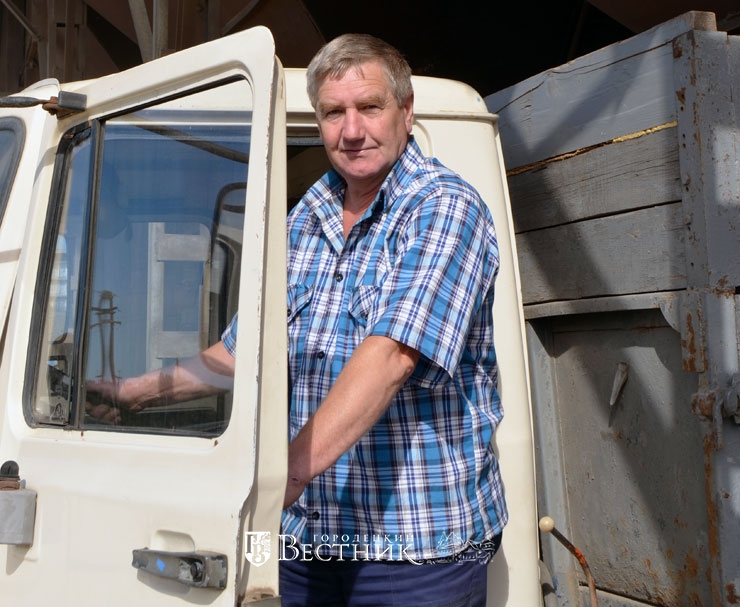 На КЗС подкатил грузовик. За рулём водитель Николай Куминский (на снимке). Он работает в хозяйстве уже много лет. Главный агроном отзывается о нём, как о надёжном и ответственном работнике. Его «ГАЗик» забирает в зернохранилище груз и отправляется в очередной рейс.