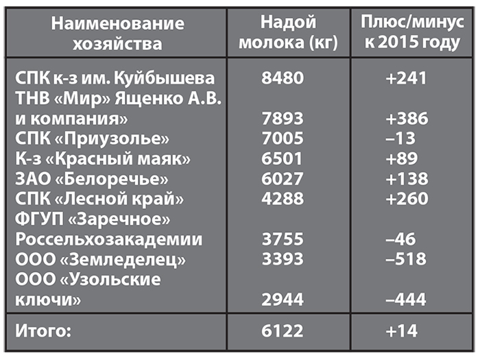 Наивысшее производство молока за 2016 год получено в племзаводах СПК колхоза имени Куйбышева, колхоза «Красный маяк», в племрепродукторах СПК «Приузолье», ТНВ «Мир» Ященко А.В. и компания»: 5088, 3966, 2802, 2684 т соответственно. Удельный вес валового производства молока этих сельхозпредприятий составляет 76% от общего по району.